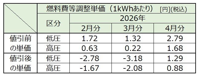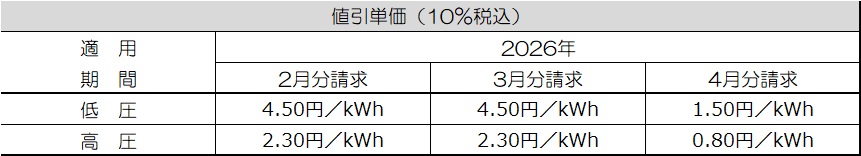 2026年2月分請求書から4月分請求書の毎月分の電気料金において、国が定める値引き単価によりお客様のご使用量に応じた値引きを実施します。