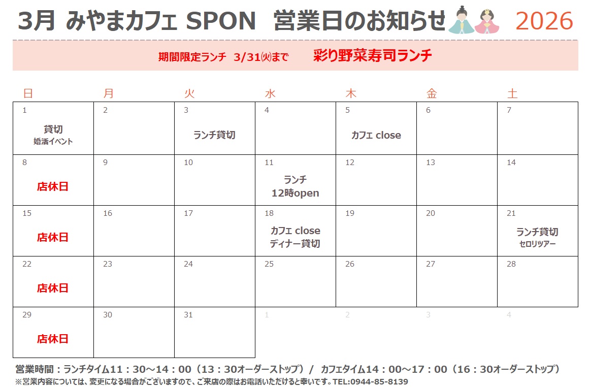 2026年3月営業日のお知らせ